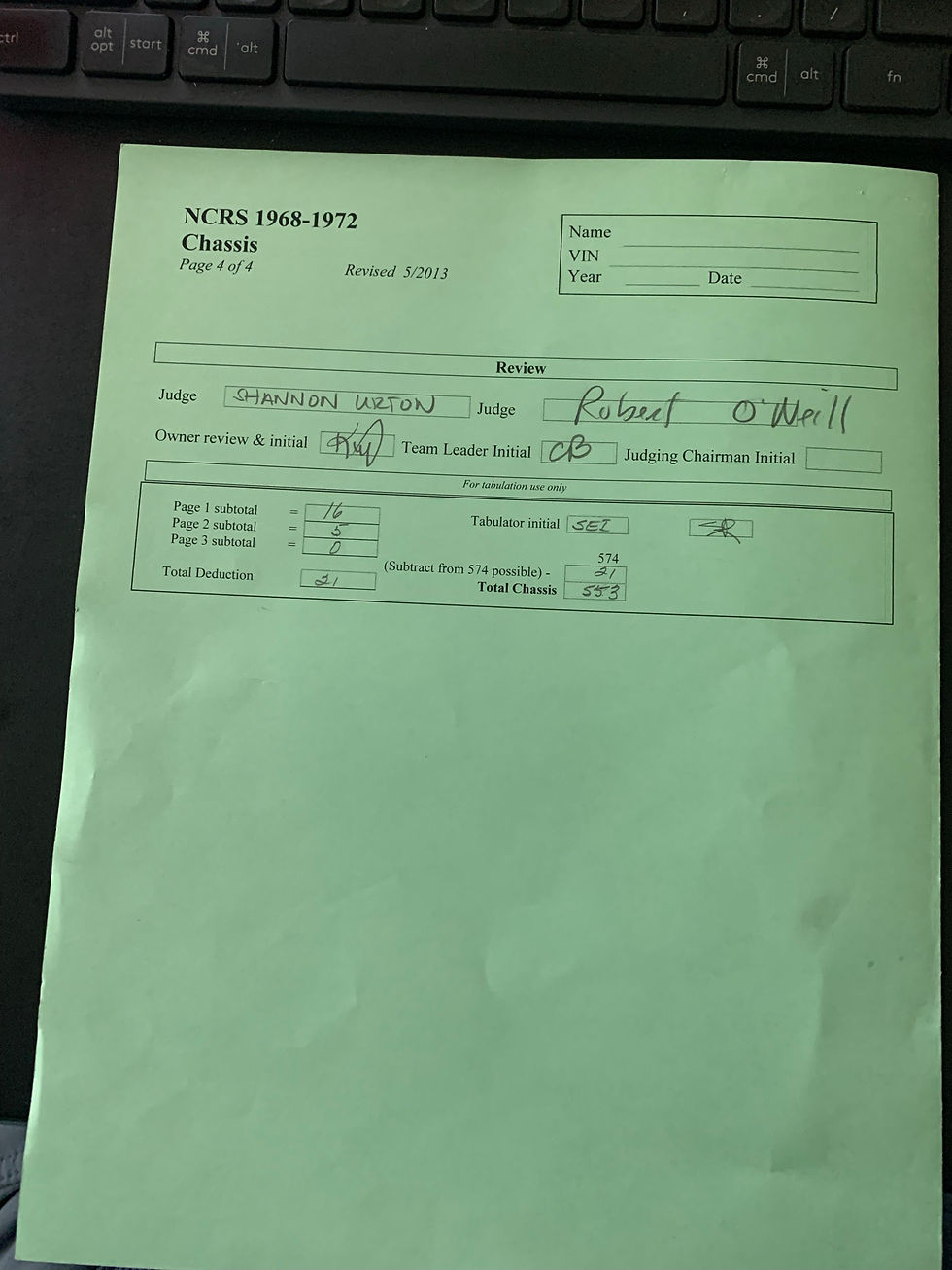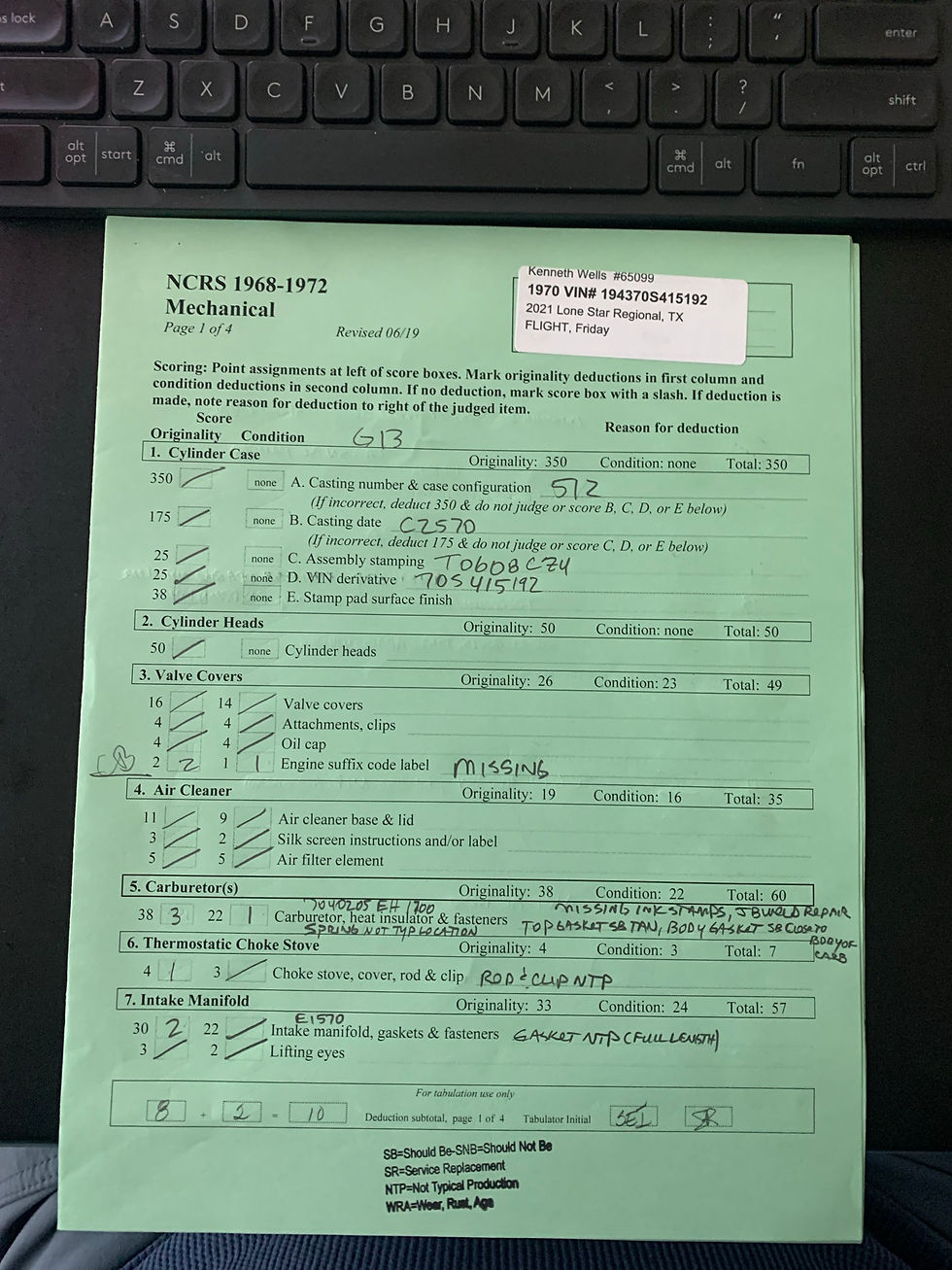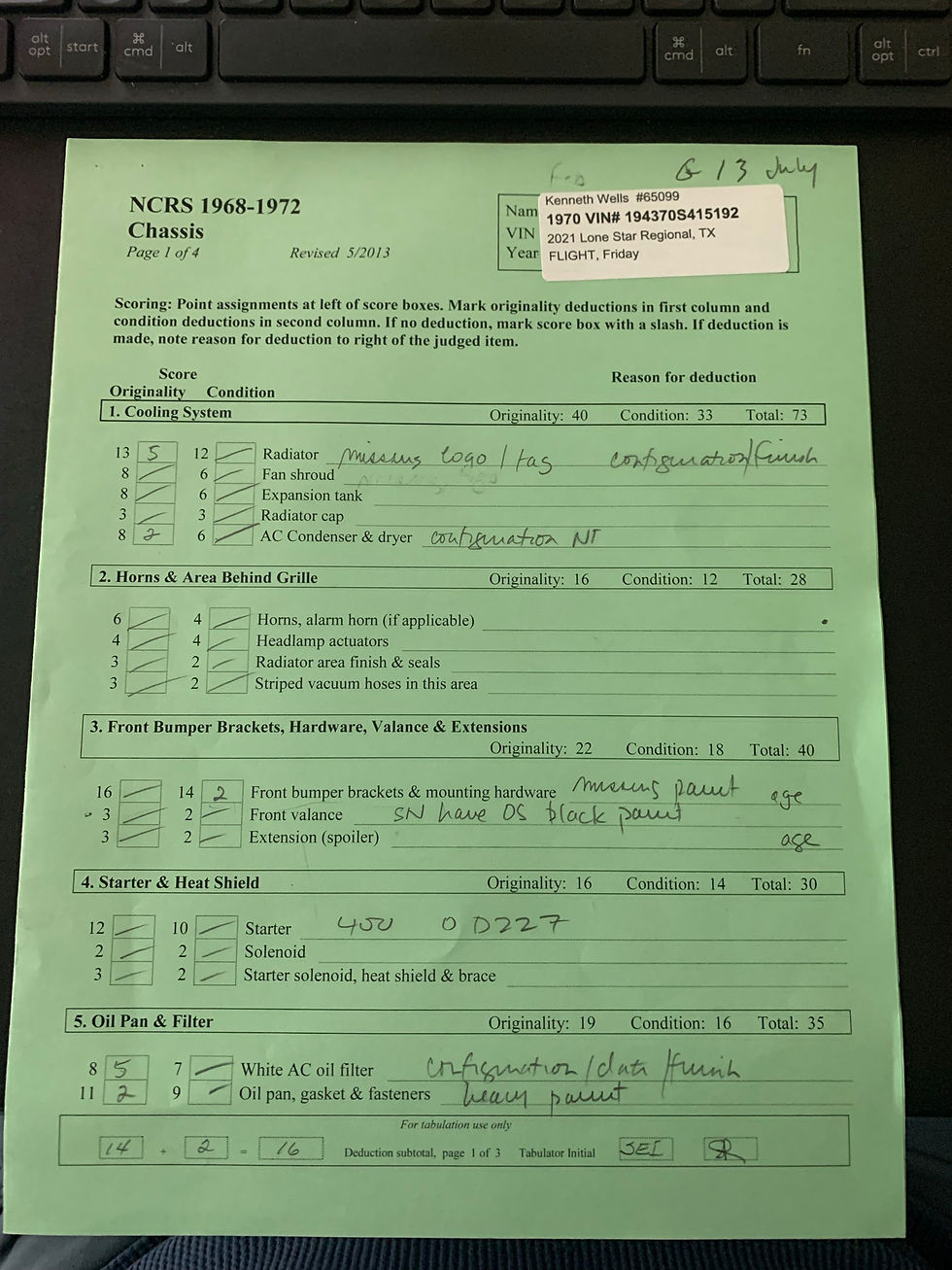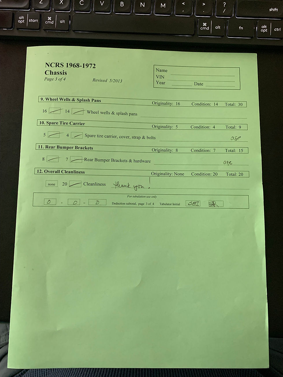 Here are the 4 scoresheets from the exterior judges. Note that almost all of the deductions were on condition (1970 era paint didn't hold up really well over the long haul.)